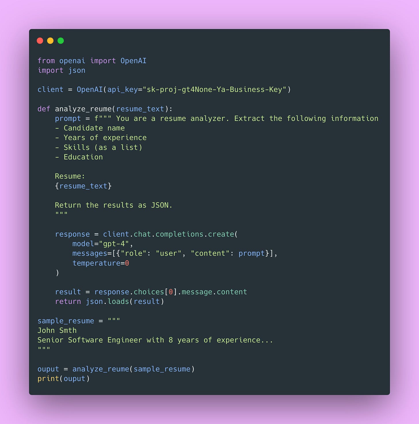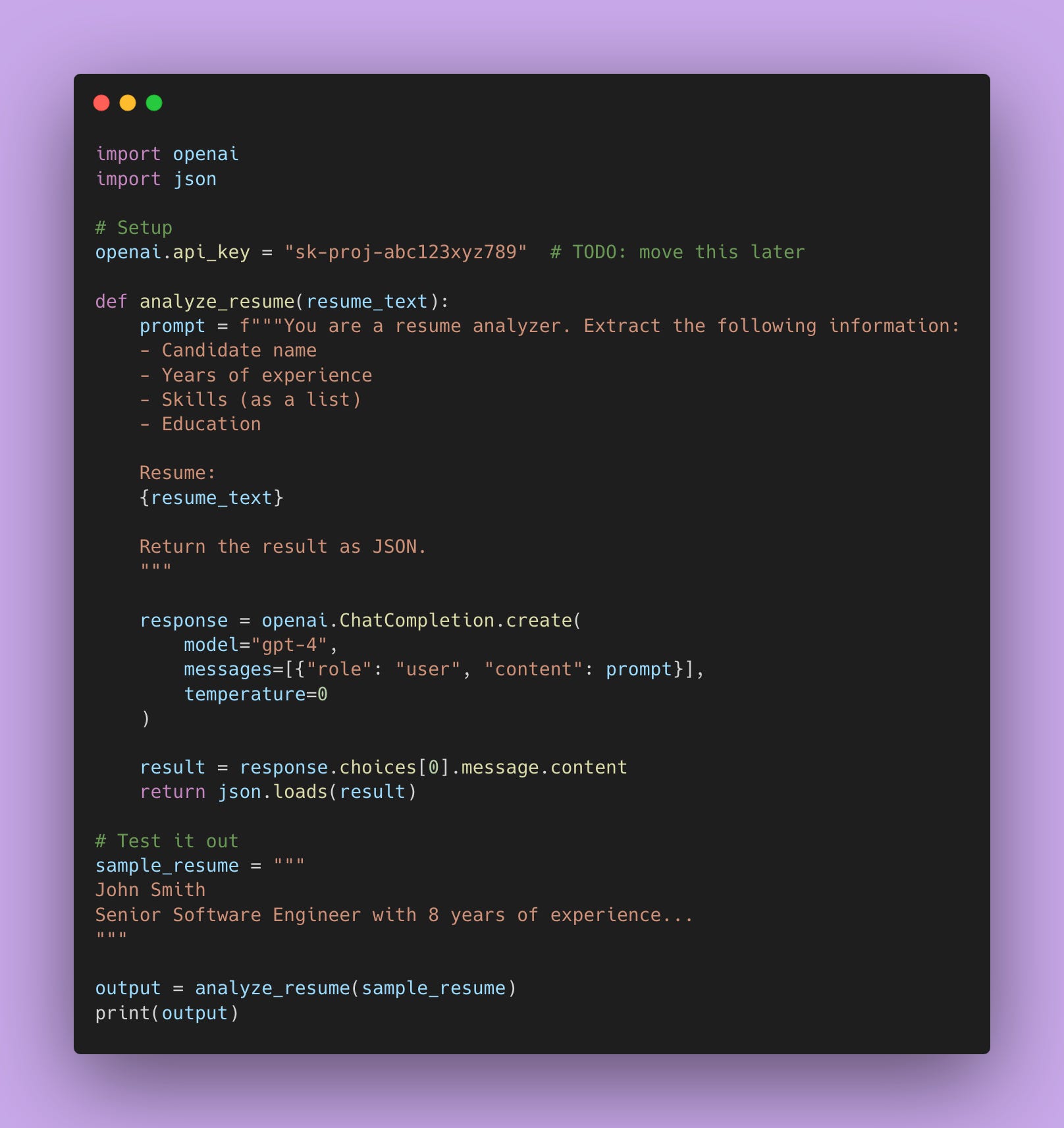 How do you test `analyze_resume()`? Right now, you can’t. Well, you can, but you’d have to actually call the OpenAI API every single time you run your tests. This creates several problems.