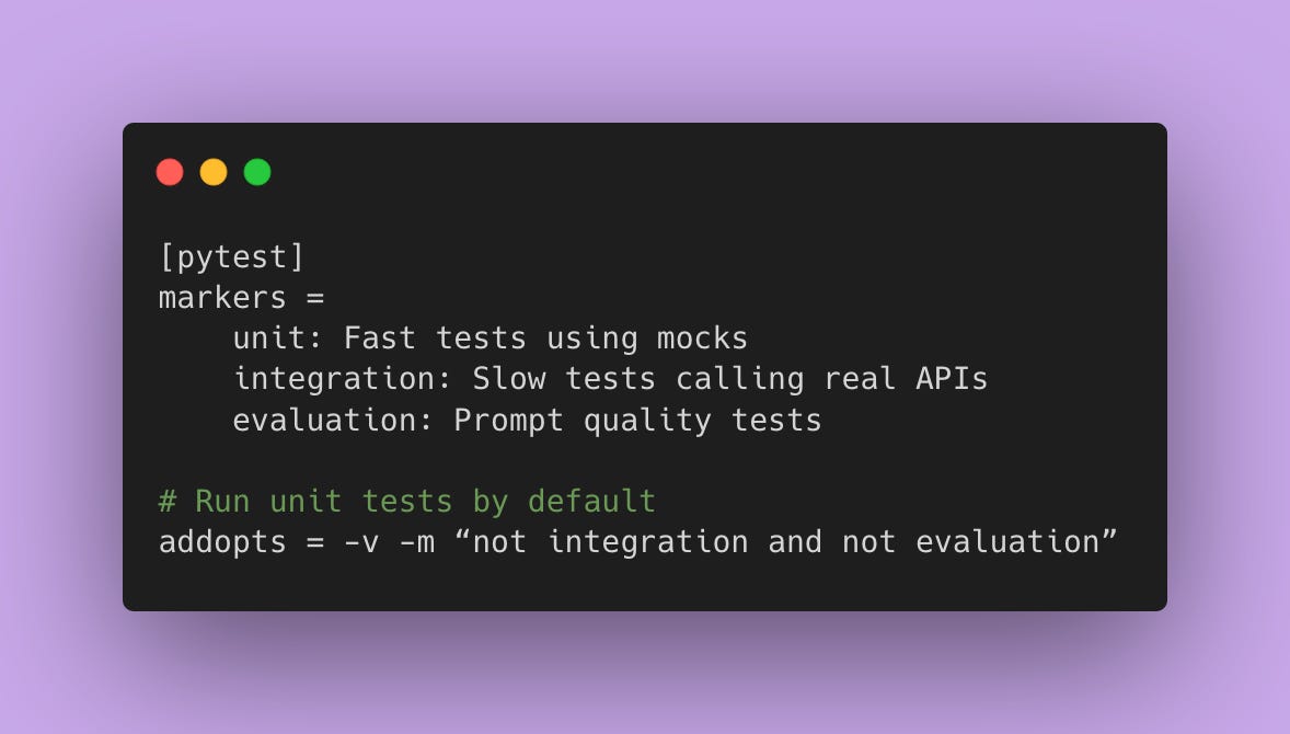 ⭐️ Bonus: Set up pytest markers so you can run your unit tests separately from integration tests. This will save you time and money as your test suite grows.