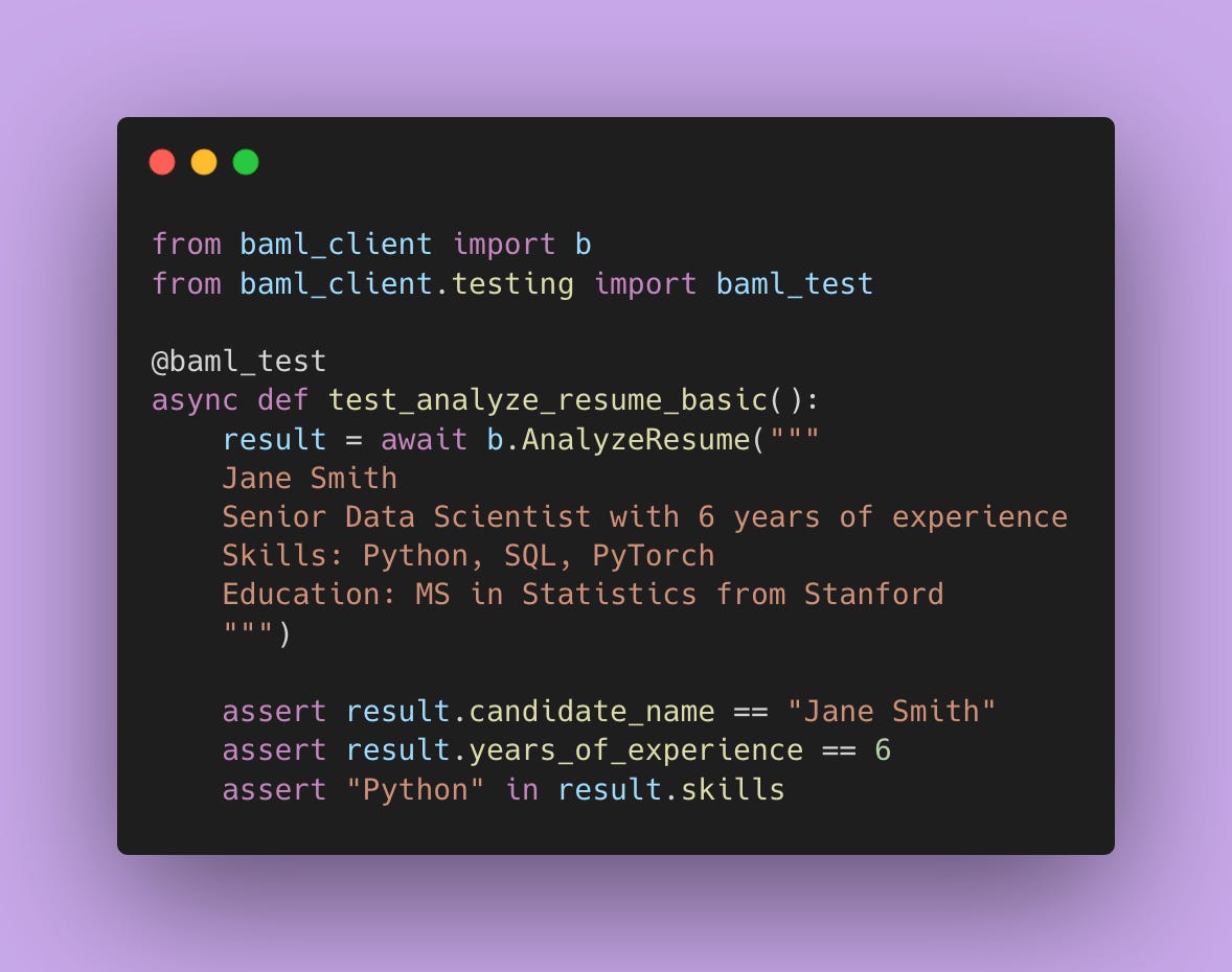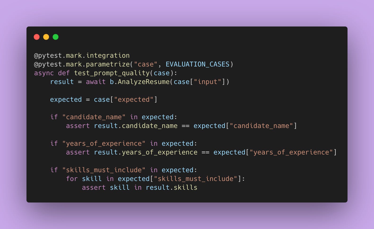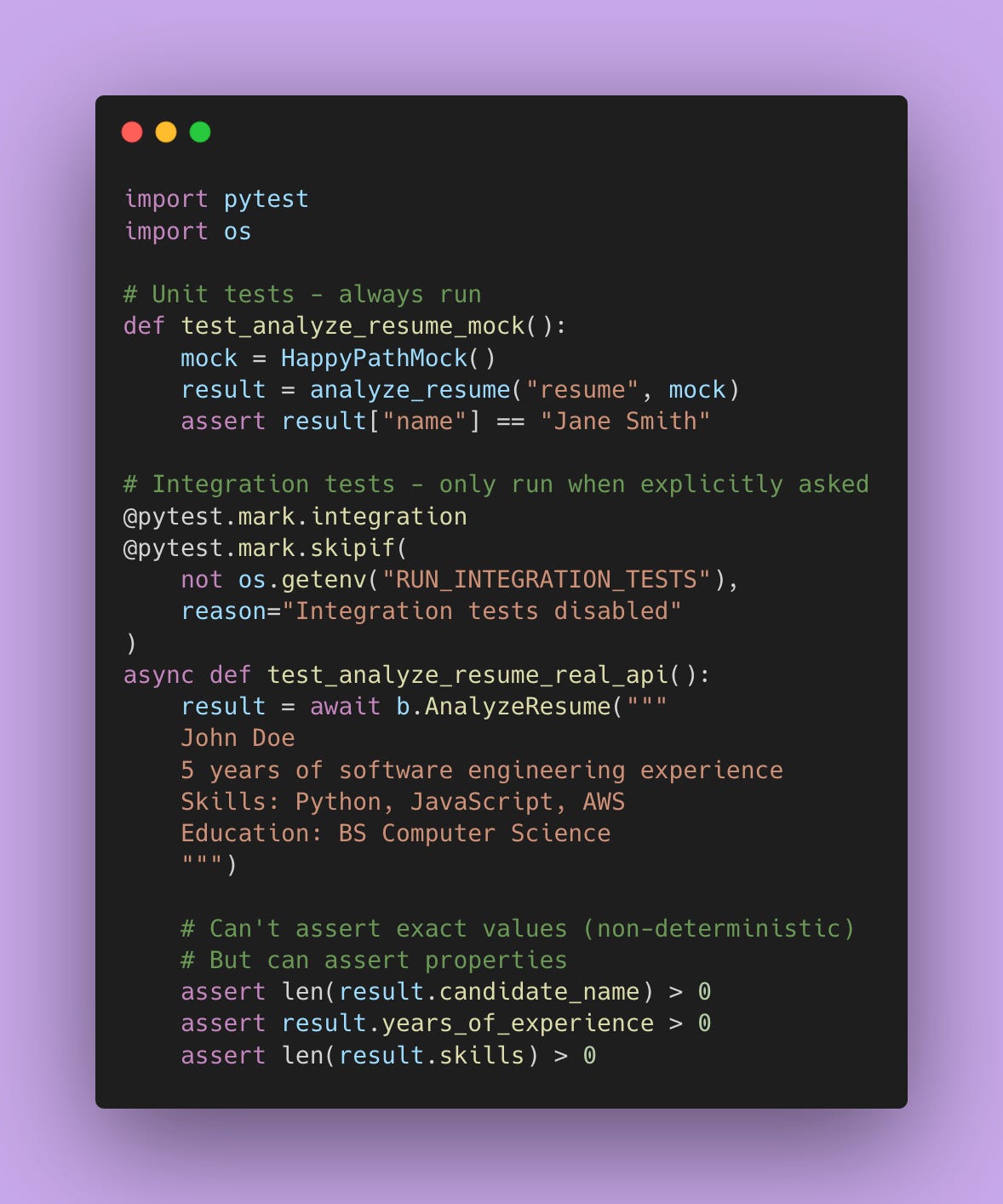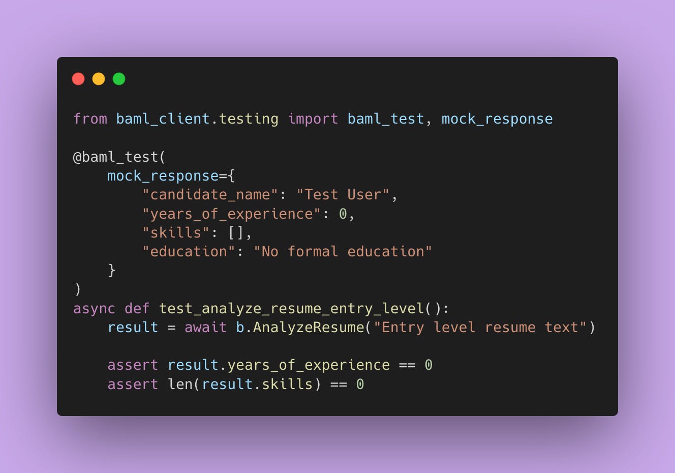 No mock setup. No dependency injection. BAML’s test client handles it. When you use @baml_test, it automatically uses a mock that returns a valid ResumeAnalysis object. No API calls, no cost, runs instantly.