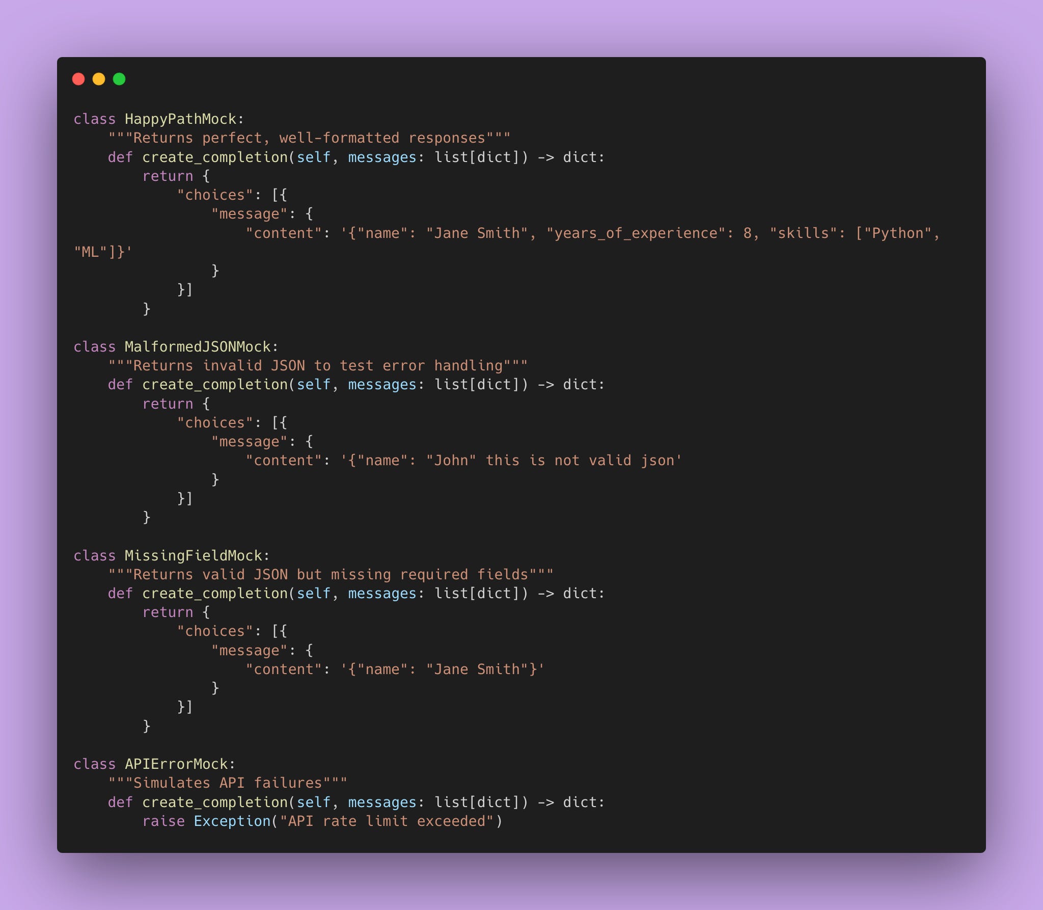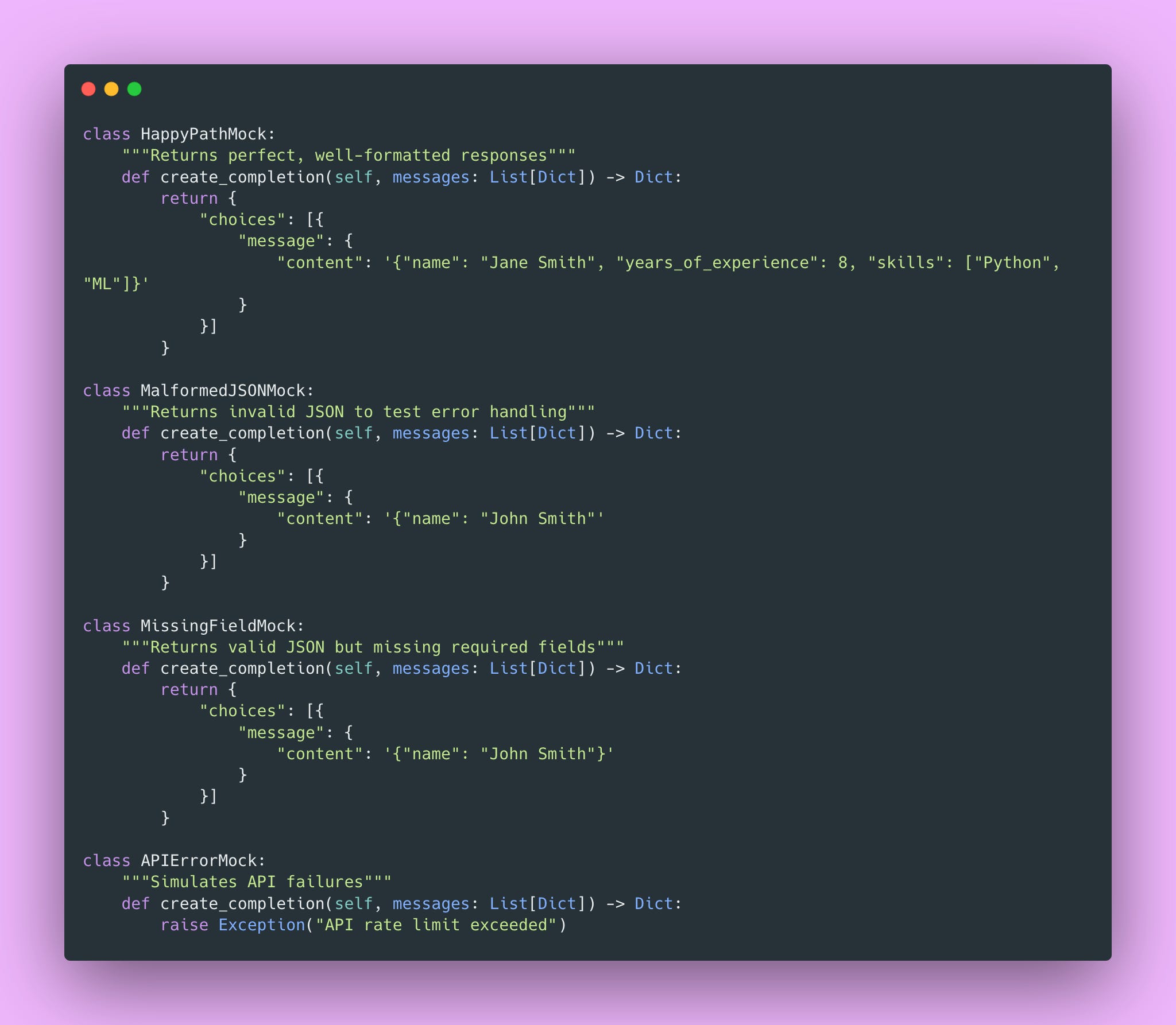 This builds confidence that your error handling actually works, without spending money on API calls.