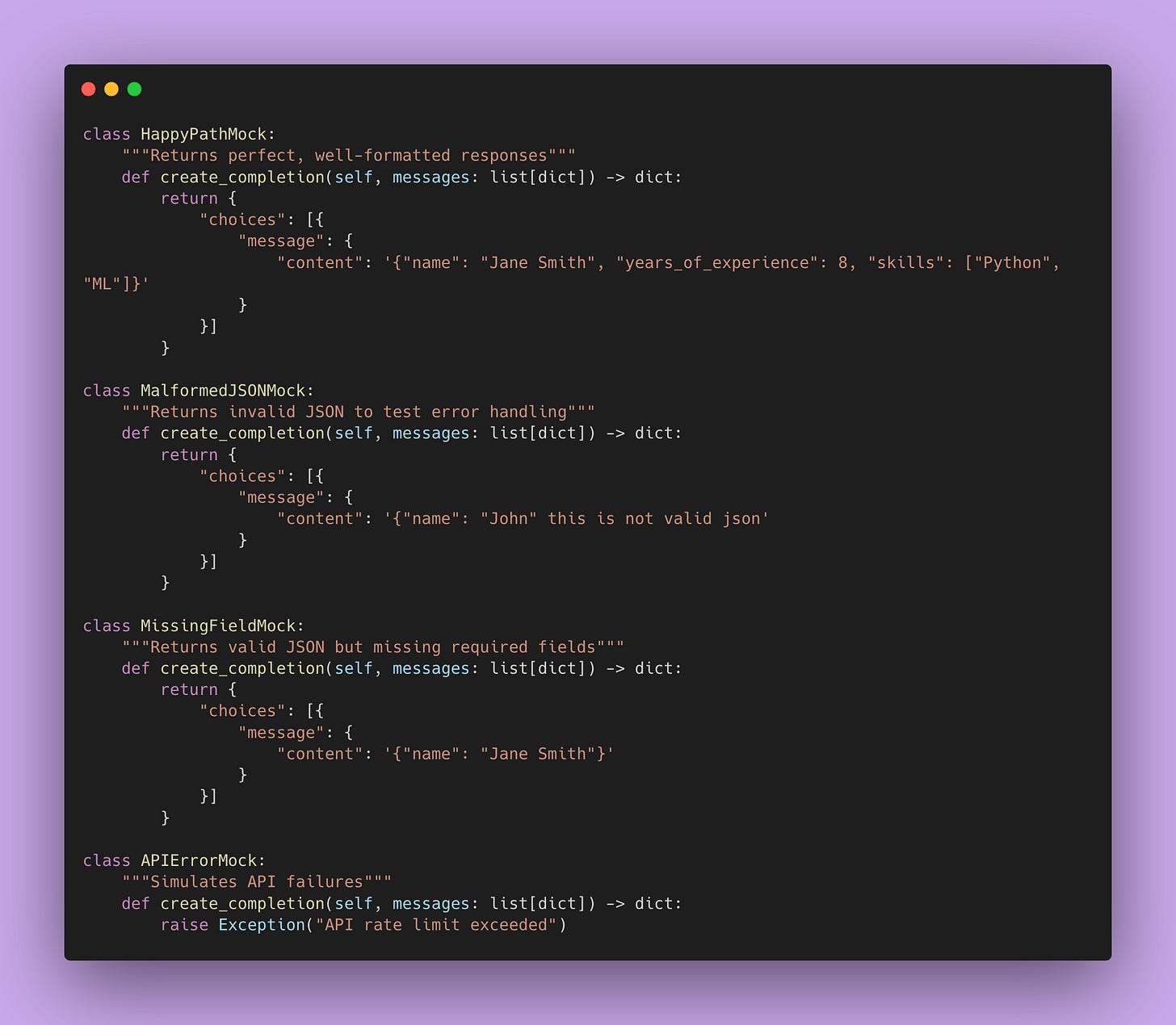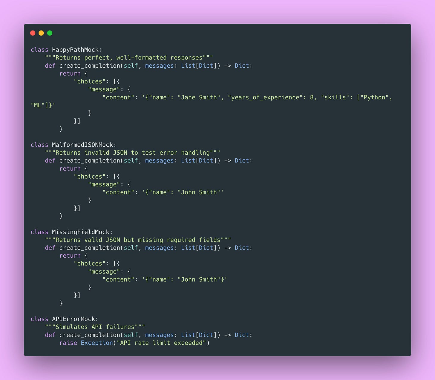📝 Note: Testing error handling is especially important for LLM applications because LLMs can return unexpected formats. If your error handling isn’t tested, you won’t discover the bugs until production (been there, learned that lesson the hard way).
