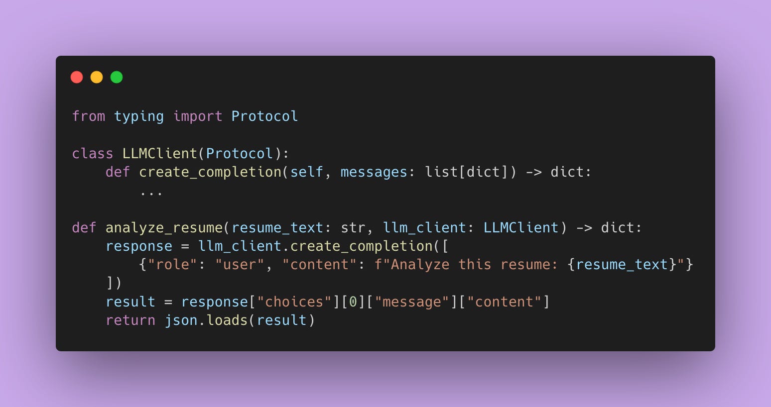 The solution: dependency injection. Make the LLM client something you can swap out.