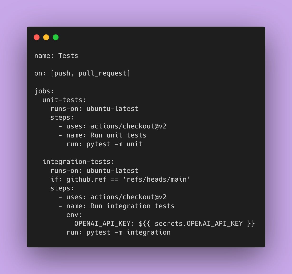 This setup gives you fast feedback during development (unit tests) while still having confidence that integration works (integration tests), without burning through your API budget. (No more wasting $5-10 every time someone pushes a typo fix 🔥💰).